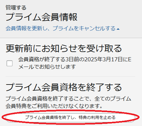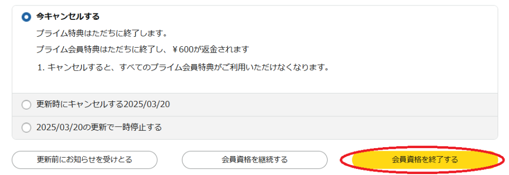 解約する方は、「特典と会員資格を終了」を選択してください。プラン変更の方は、「他の会員プラン」を選択しましょう。