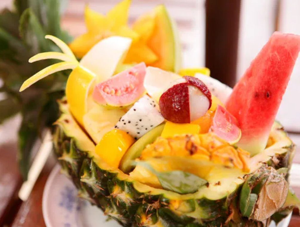 パイナップルを半分にカットした中に、ドラゴンフルーツや季節のフルーツたっぷりのメニューもあります。