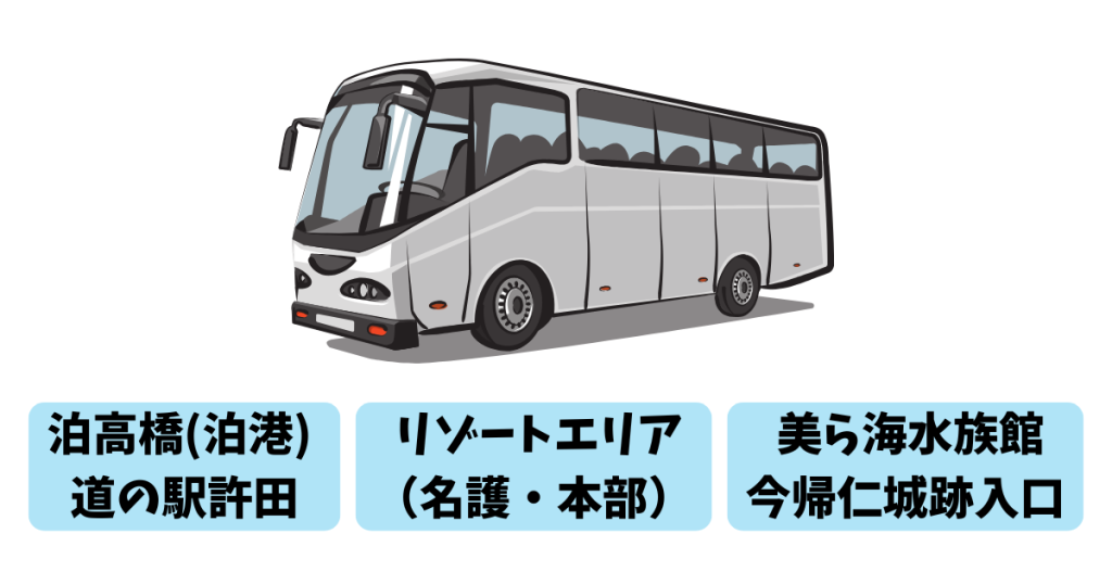 | やんばる急行バス | 1日11便 【始発】10:10 【最終】19:40 | 1日11便 【始発】5:00 【最終】16:50 | 那覇空港、県庁北口、泊港、道の駅許田、名護市役所前、名護バスターミナル、本部港、ホテルマハイナ、美ら海水族館、ホテル美ら海、オリオンホテルモトブ、今帰仁城跡など ※ヒルトン沖縄瀬底リゾート直行バスあり。 |