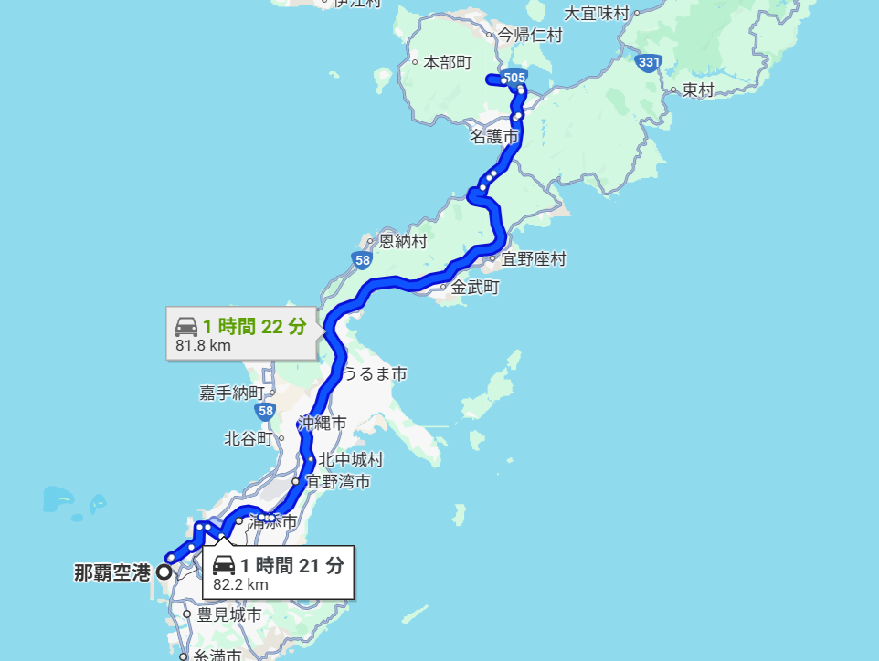 那覇空港からの移動時間は、最短で約1時間30分(車)、最長で約3時間弱(高速バス)くらいが目安です。