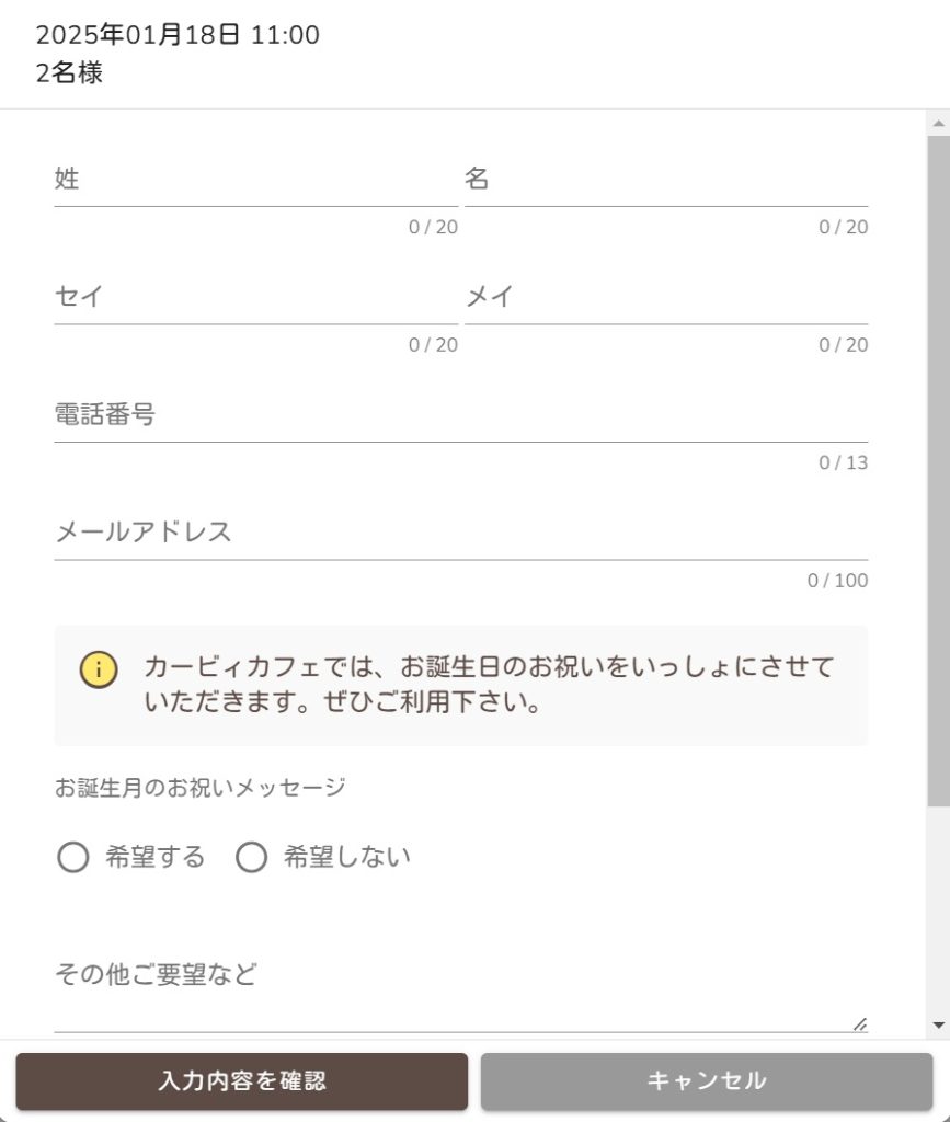 (氏名・電話番号・メールアドレス・お祝いメッセージの有無・アレルギーの有無など) - 入力内容を確認して、予約完了。
