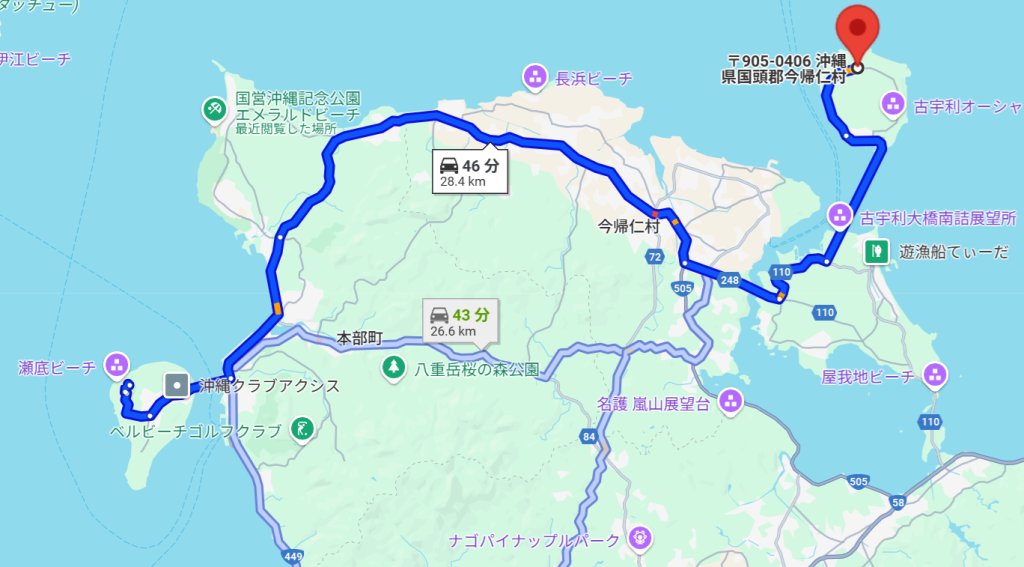 沖縄美ら海水族館や備瀬のフクギ並木、今帰仁城跡(世界遺産)なども通るので、観光にとっても便利。